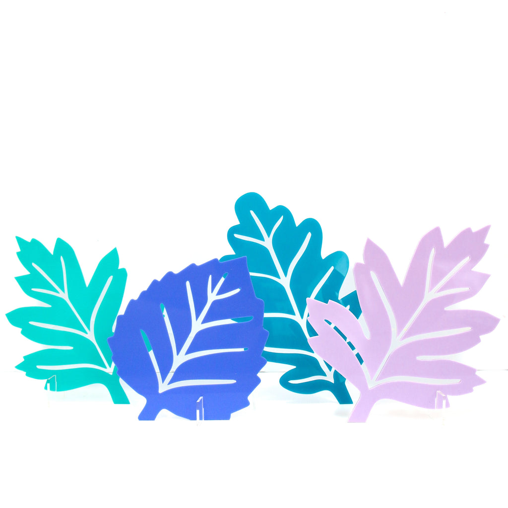 Set of 4 acrylic fall leaves with clear stands - 6" - 11" tall in shades of blue/lavender.