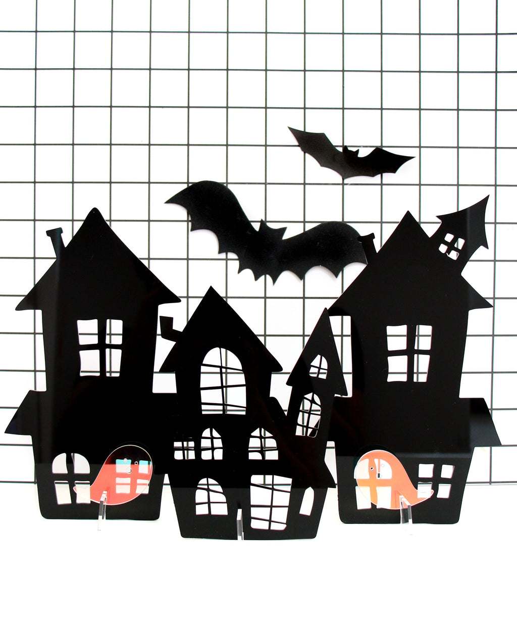 A cute set of Haunted Acrylic Houses with two friendly iridescent ghosts. Come in a set of 3 made from black acrylic. measure appx. Measure 5 -10" tall.