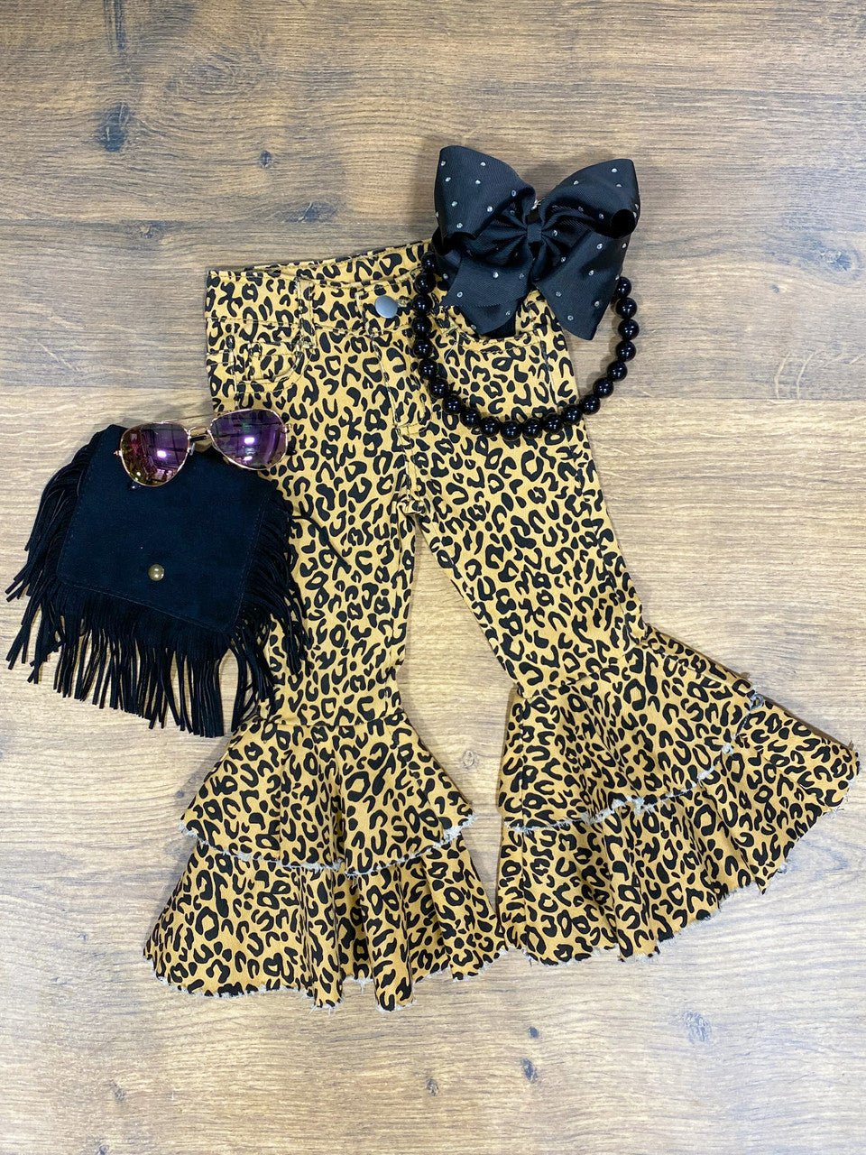 Take a walk on the wild side in these Double Ruffle Bell Bottoms! Featuring a fierce animal print that will spice up any outfit, these jeans also have double ruffle detailing for added flair. Stand out and make a statement with these playful and unique bottoms.