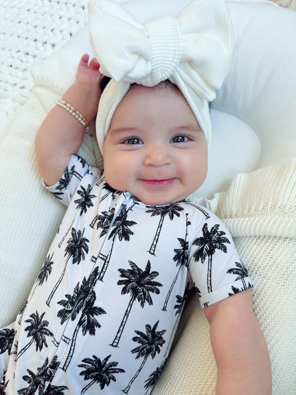 Bring the island breeze to your little one’s wardrobe with our Bamboo Shorty Romper | Palm Style White.