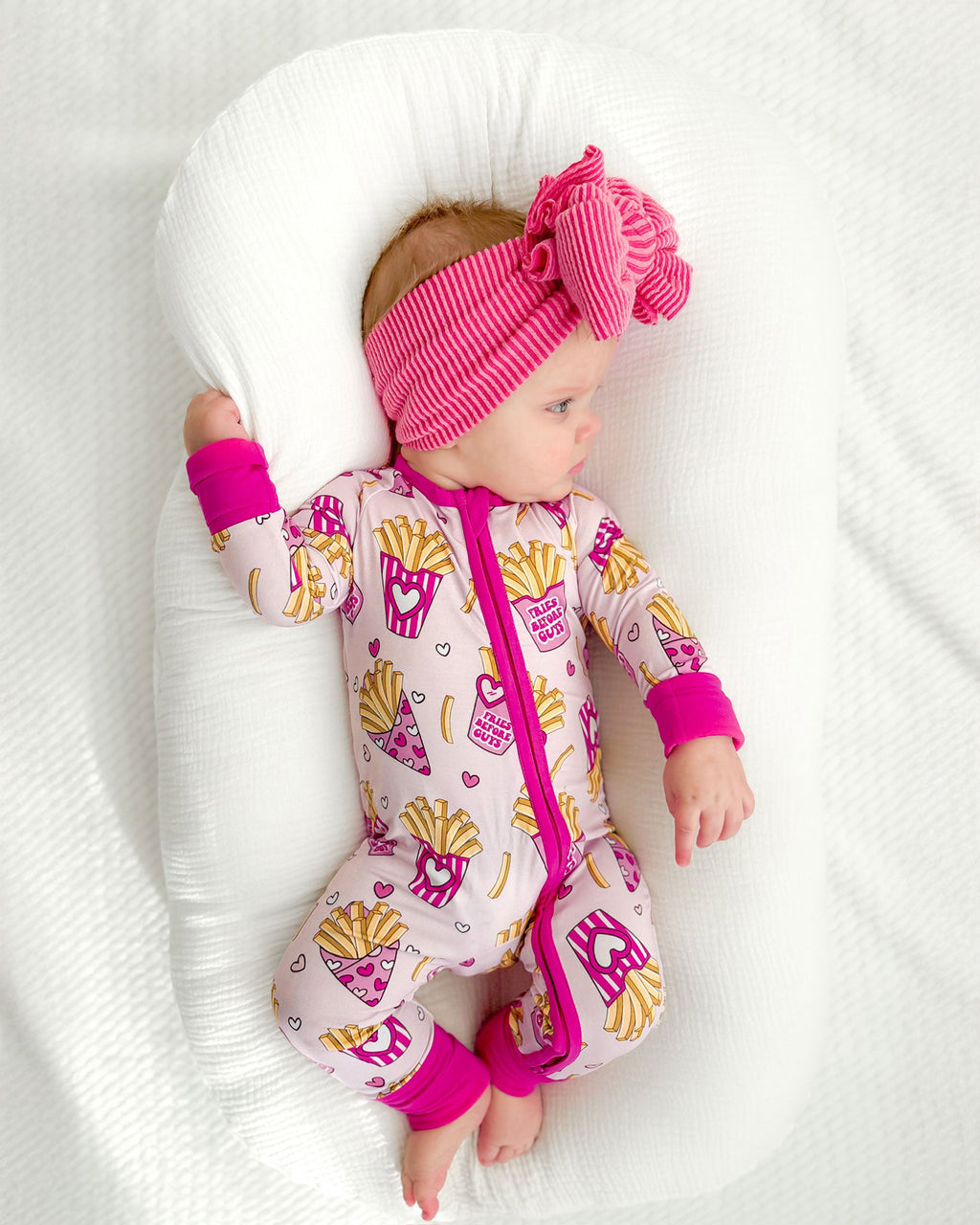 Celebrate in style with our bamboo zippy, featuring an exclusive, playful Valentine's Day print that’s sure to bring smiles and giggles. Crafted from ultra-soft bamboo fabric, this romper keeps your little one comfy and cozy with fold-over mittens and footies for extra warmth. The two-way zip closure makes dressing a breeze, while the adorable print makes it perfect for those who know that fries are forever!