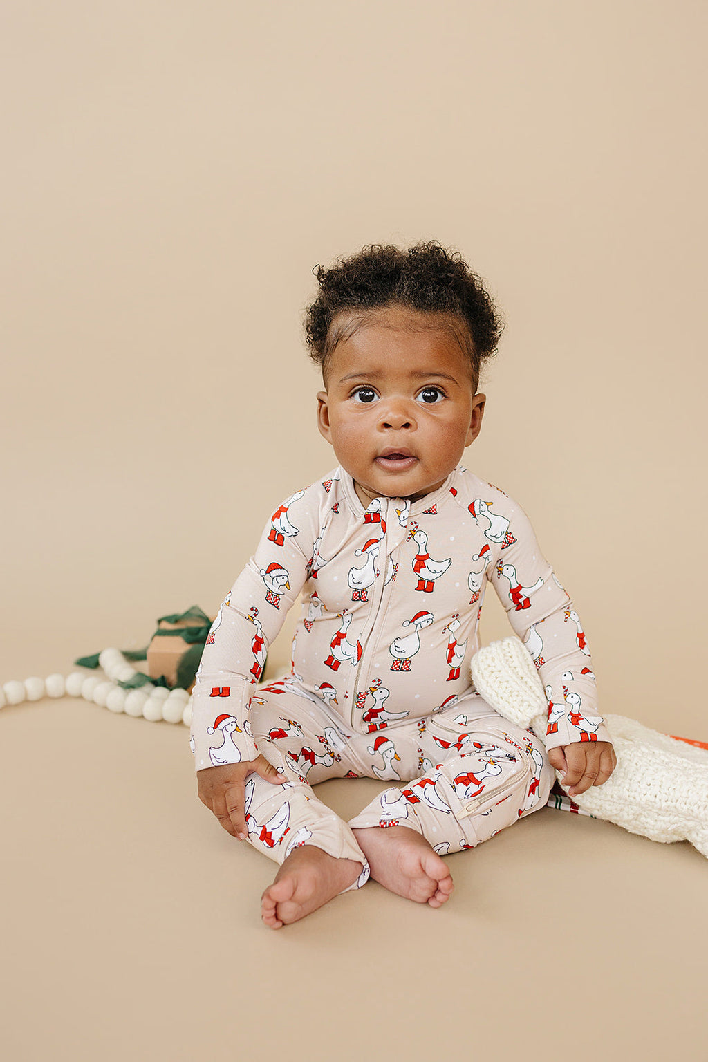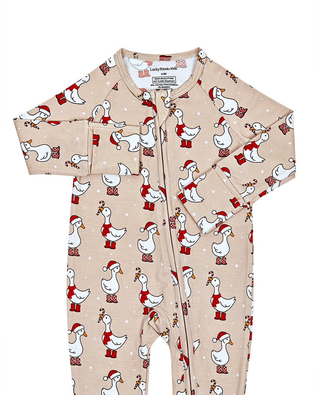 The Bamboo Zip Romper | Merry Goose brings a touch of charm and whimsy to the holiday season. Featuring playful geese dressed in festive scarves and hats, this sweet print captures the cozy joy of winter days. Made from buttery soft bamboo fabric, it keeps your little one snug and happy from morning giggles to bedtime cuddles by the tree.