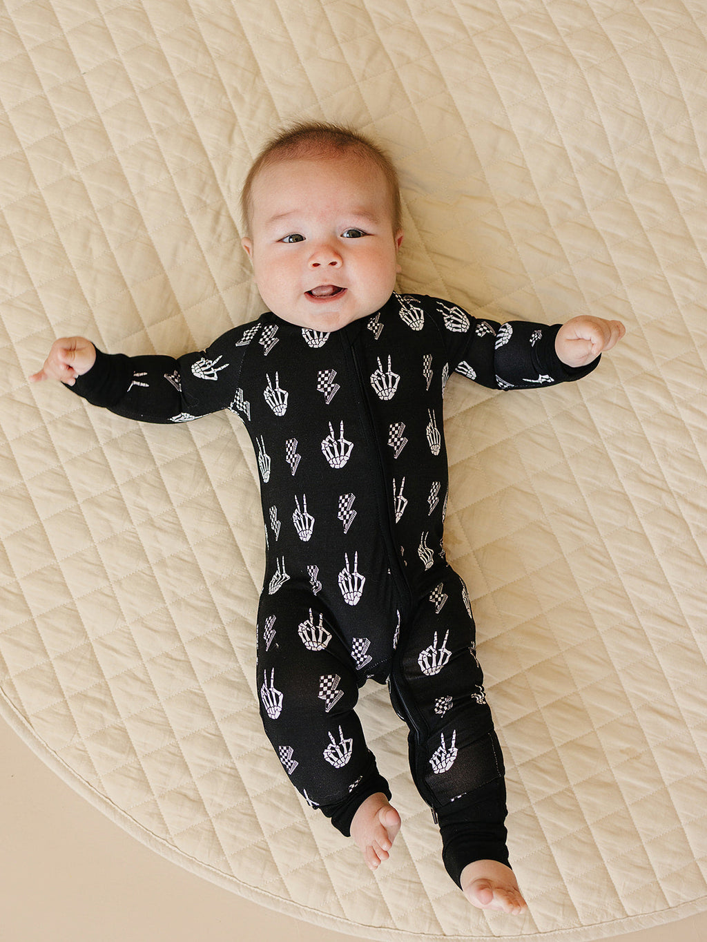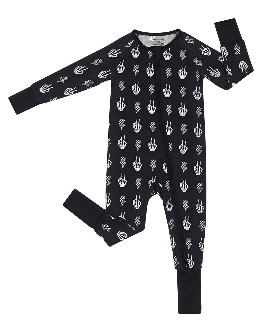 The Bamboo Zip Romper | Skelly Vibes is all tricks, treats, and skeleton vibes—made for the tiniest rebels of spooky season.
