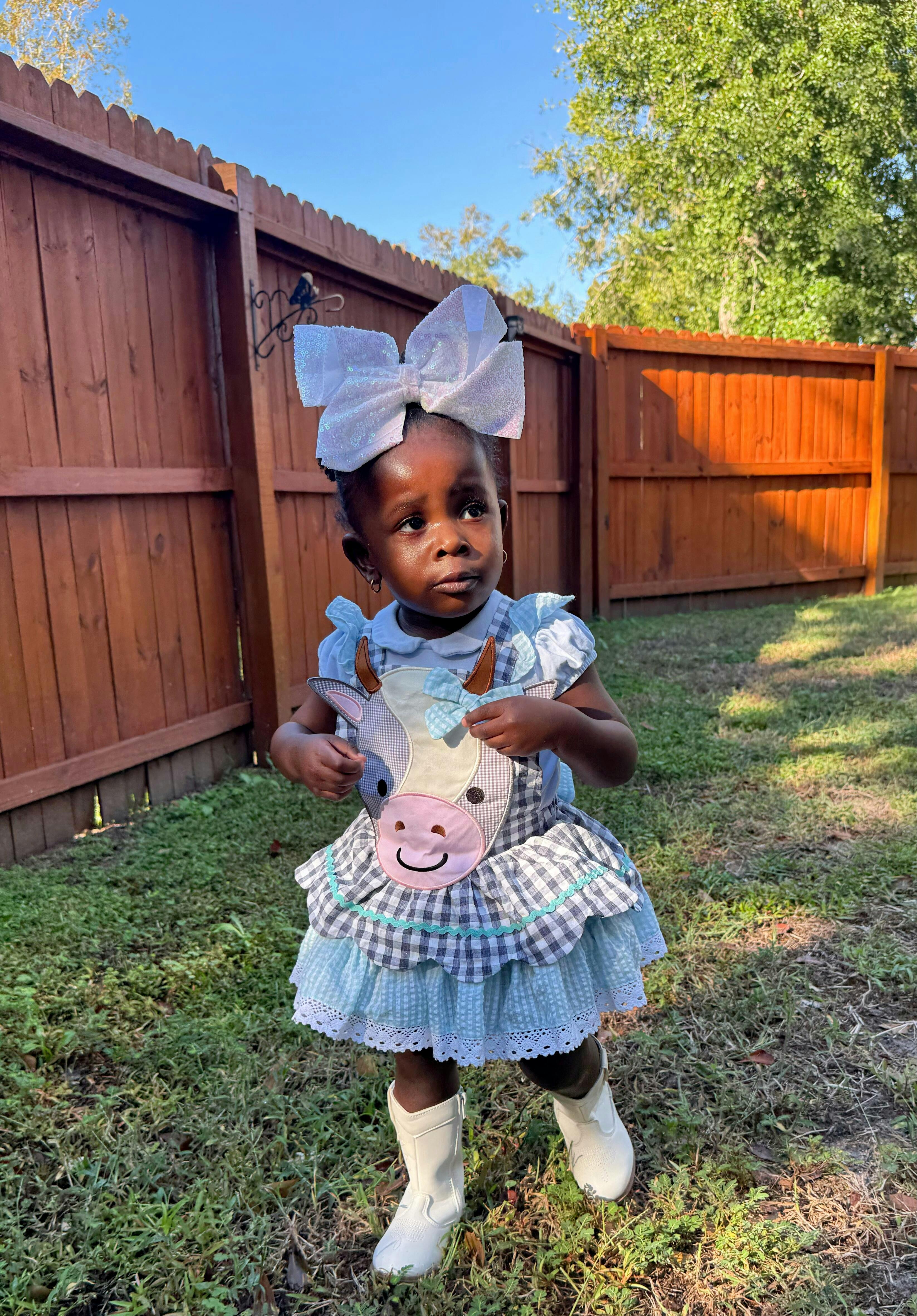Our Calista The Cow Pettiskirt Bubble is bursting with girly details. A navy blue gingham bubble features a double layer pettiskirt accented with ric rac trim and a scallop hem. The back features a beautiful, oversized bow with adjustable criss-cross straps. This outfit is perfect for a trip to the zoo!