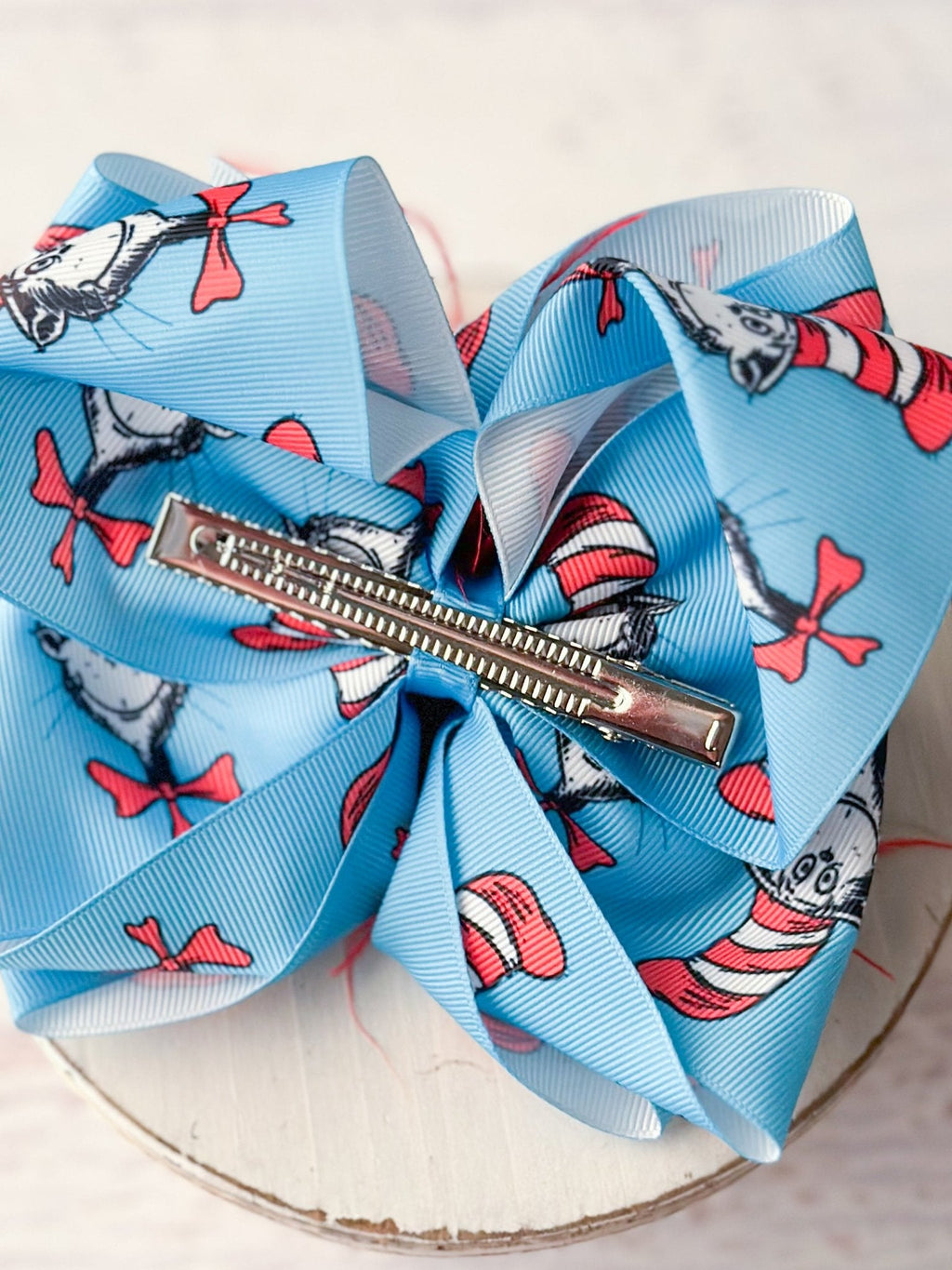 Be bold and funky with this Cat In the Hat ostrich puff hair bow! Featuring a whimsical design, this hair accessory adds instant fun to any outfit. Perfect for all occasions, this bow is sure to make a statement wherever you go.