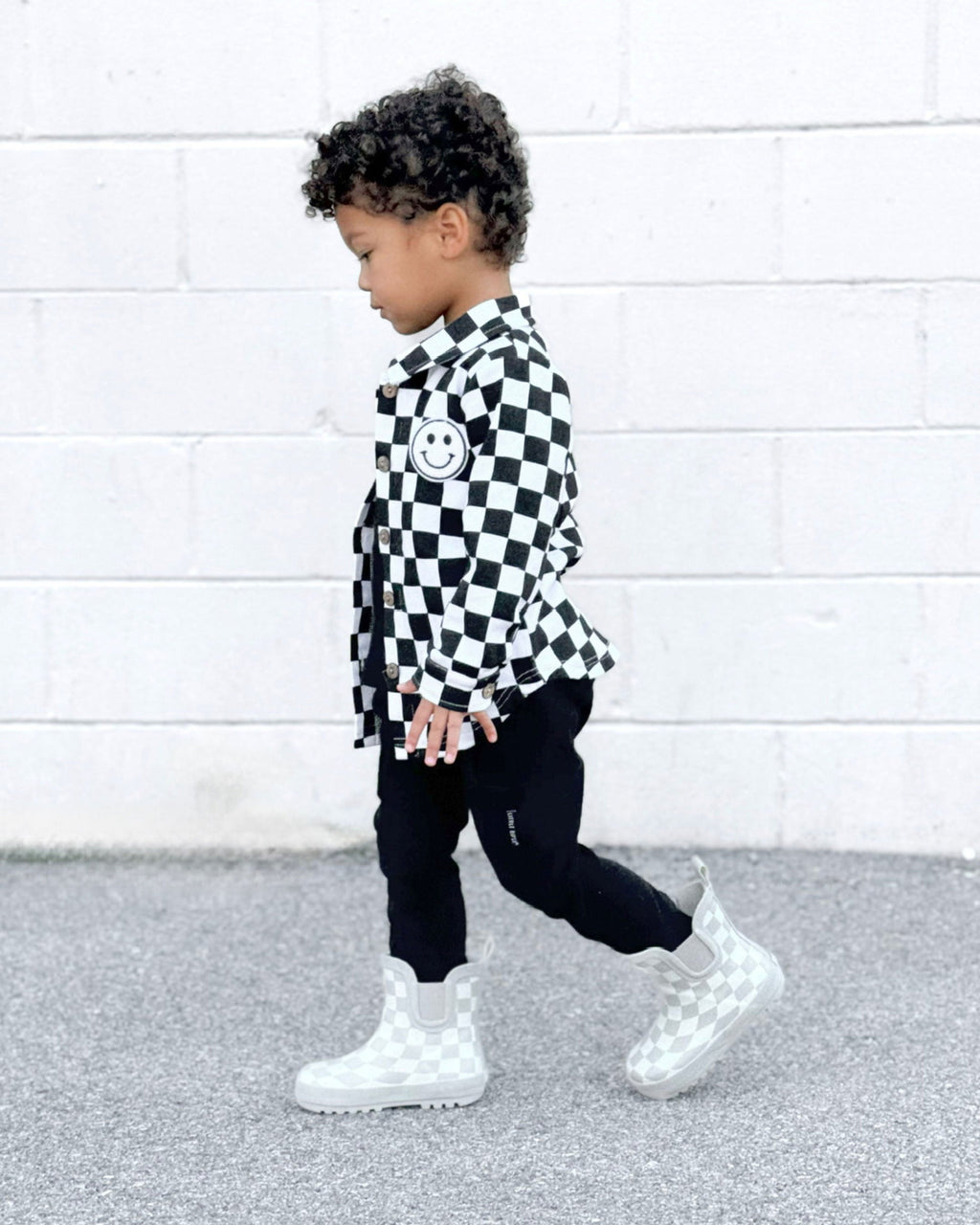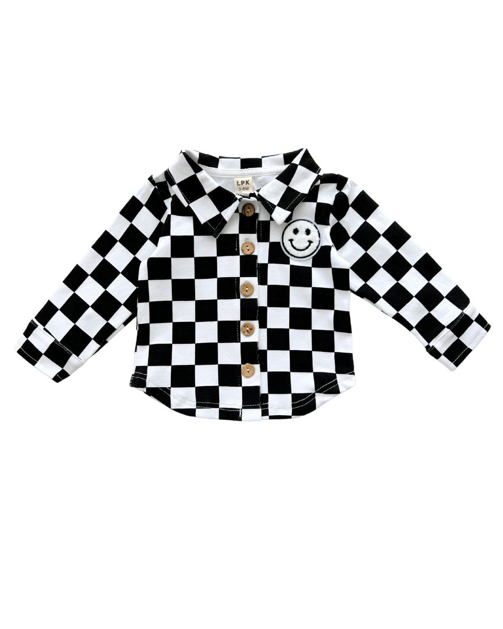 Get ready for shacket season! Our shacket is made with a cozy blend of cotton and spandex, allowing for a comfortable and flexible fit. The playful checkered print and fun smiley patch add a quirky touch to this must-have button down. Perfect for layering or wearing on its own, the functional button closure at the center front makes it easy to style and wear.