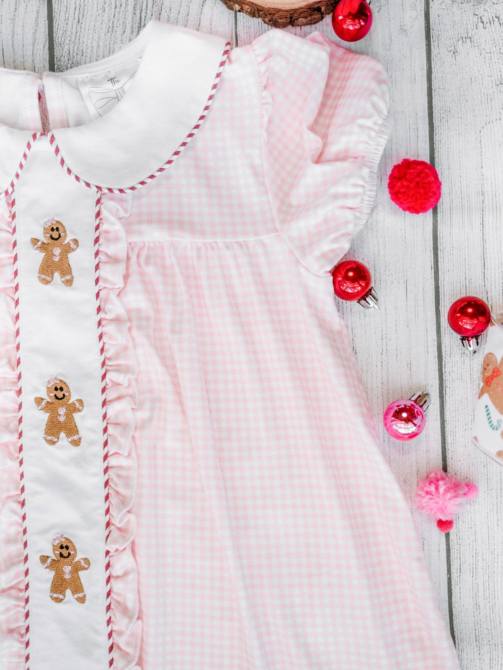 Sweeten up your little one’s holiday style with our Gingerbread Friends Pink Embroidered Dress! This charming Christmas dress features a soft pink gingham pattern and an adorable row of embroidered gingerbread friends down the front, creating a whimsical and festive look perfect for the holiday season.