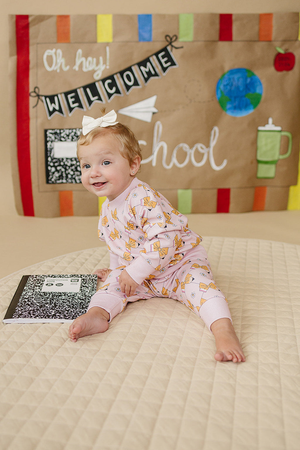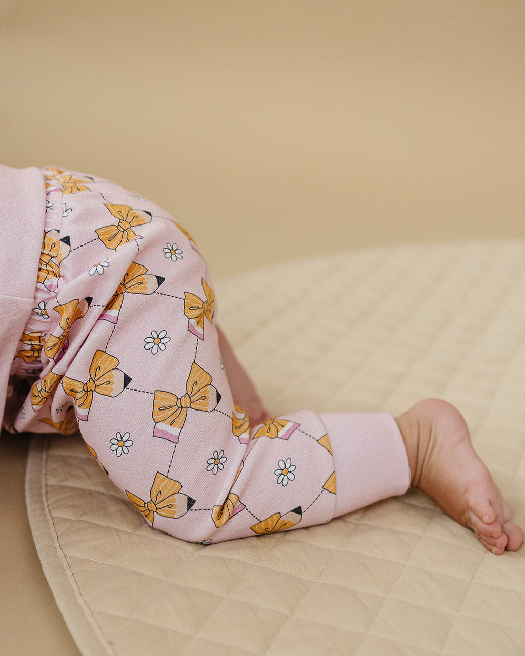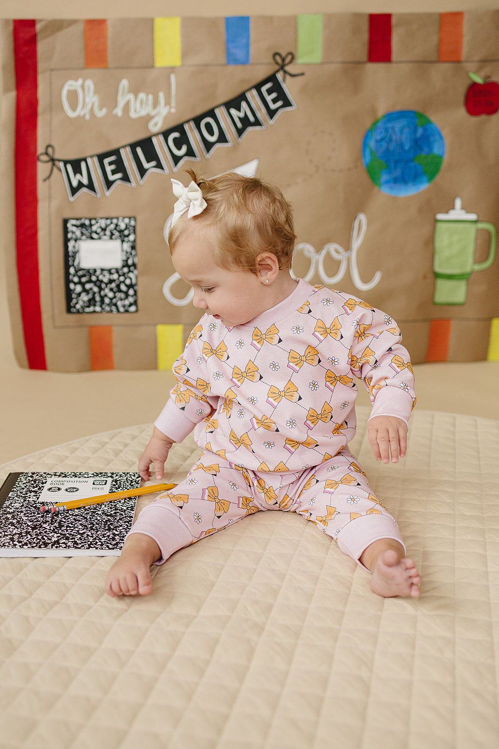 Pencil bows, daisy doodles, and the dreamiest shade of pink. The Jogger Set | Pixie Pencil is ready for recess, reading time, and after school snuggles.