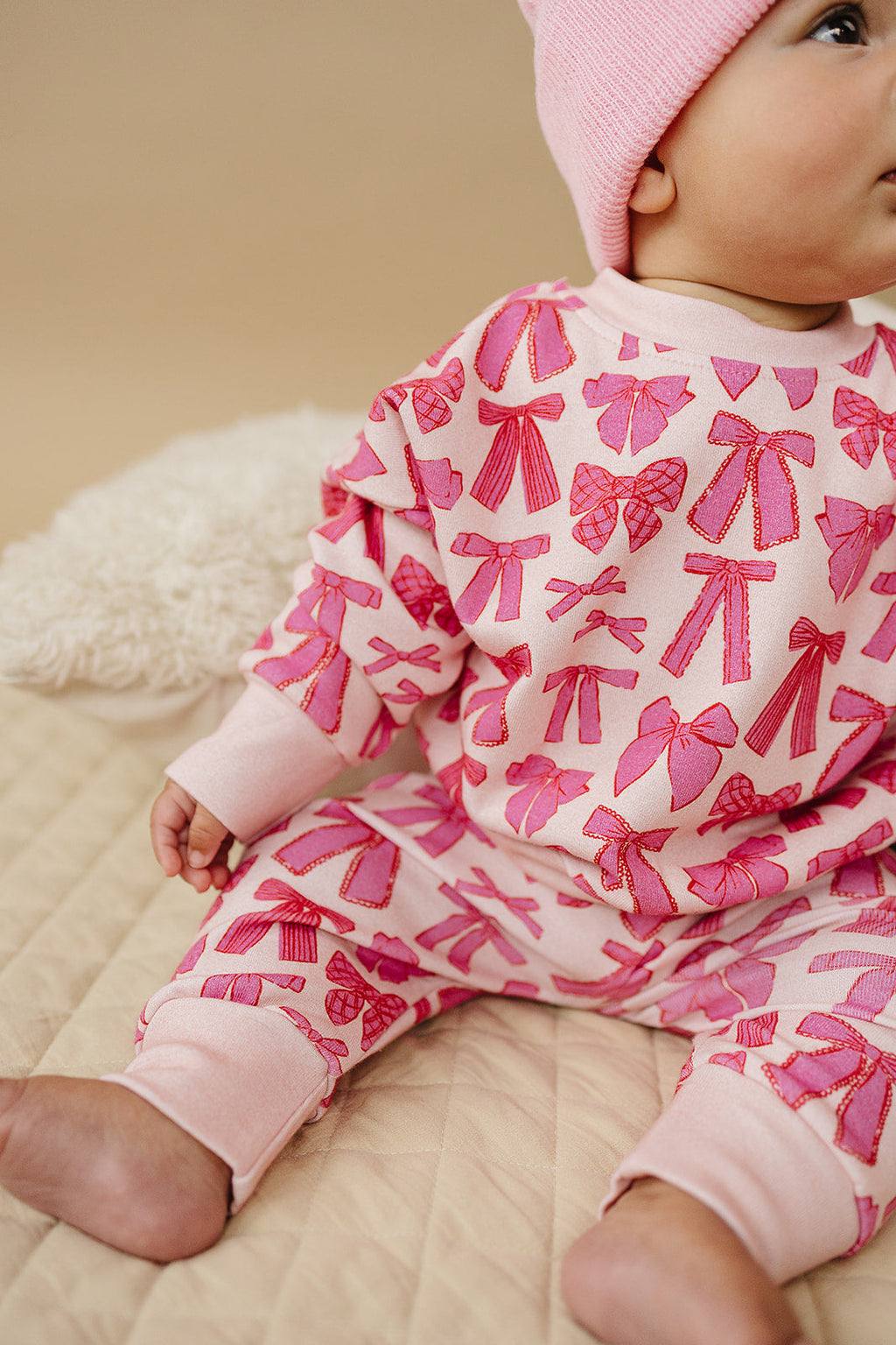 The Whimsy Bows | Jogger Set blends playful charm with everyday ease. Made from soft cotton for breathable comfort, this set features a relaxed fit that allows for both movement and style. The whimsical bow accents add a touch of fun, making it a go-to outfit for active days as well as laid-back moments.