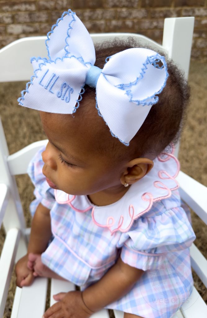 Let little sister show off her "LlL SIS" pride with this fun and unique medium hair bow. She'll be sure to stand out in the crowd with its whimsical moonstitch edge and embroidered “LIL SIS” status. A radiant look that will surely bring a smile to everyone's face! This bow is sure to stay in her hair all day with our patented WeeStay™ no-slip hair clip.