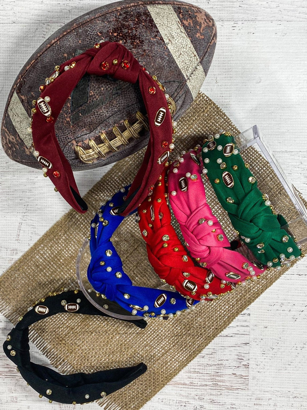 Score a touchdown in style with our Maroon Football Glam Headband! This headband features a sleek black design perfect for any football fanatic. Keep your hair out of your face and show off your team spirit with this functional and fashionable headband. Game on!