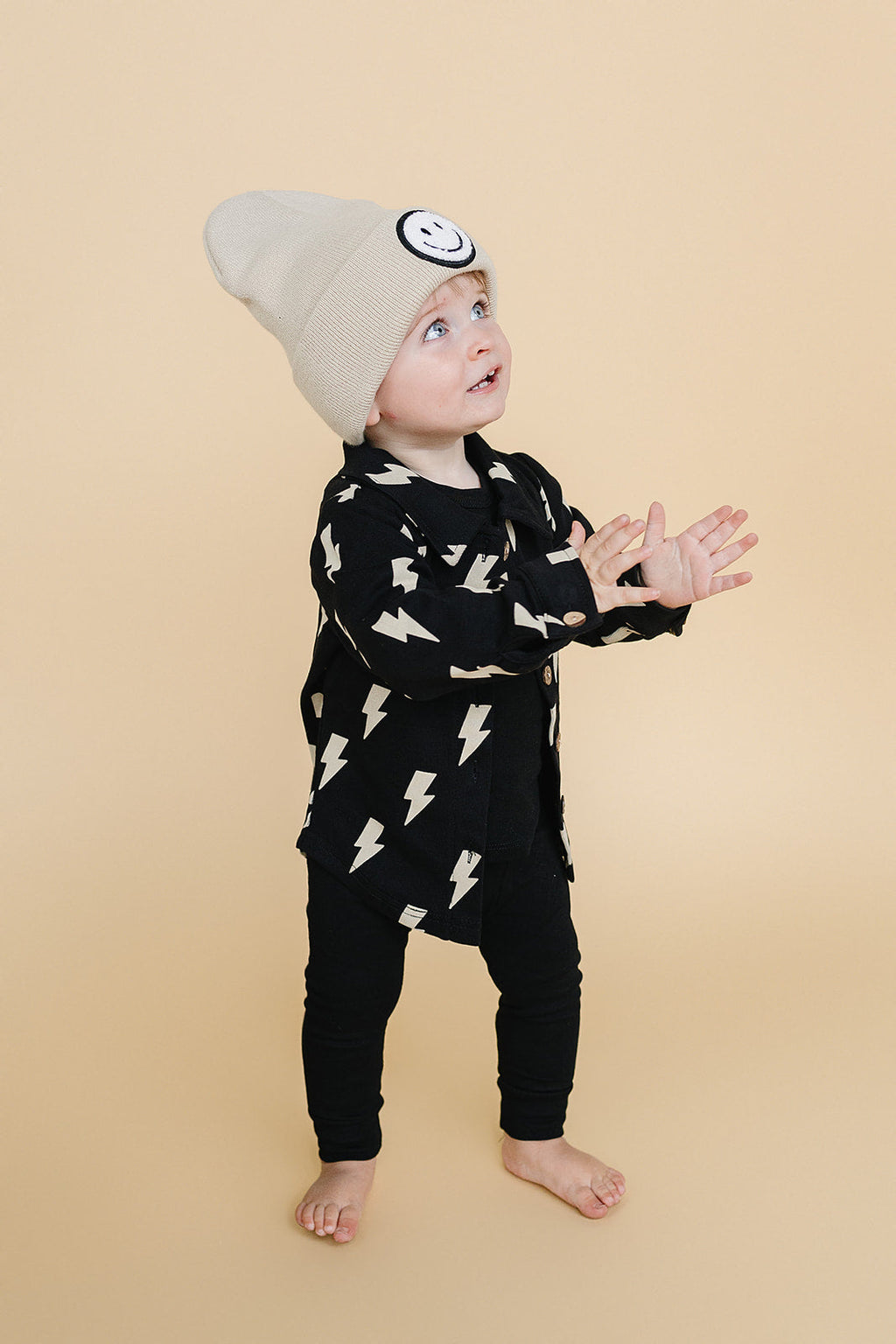 It’s shacket season! Made from soft cotton, this piece is perfect for layering or wearing on its own. With a functional button closure at the front, you can effortlessly transition from casual to dressy, making it a versatile addition to your wardrobe. Pair it with one of our cotton lounge sets and a smiley beanie to complete the look! Available in sizes from newborn to 9Y.