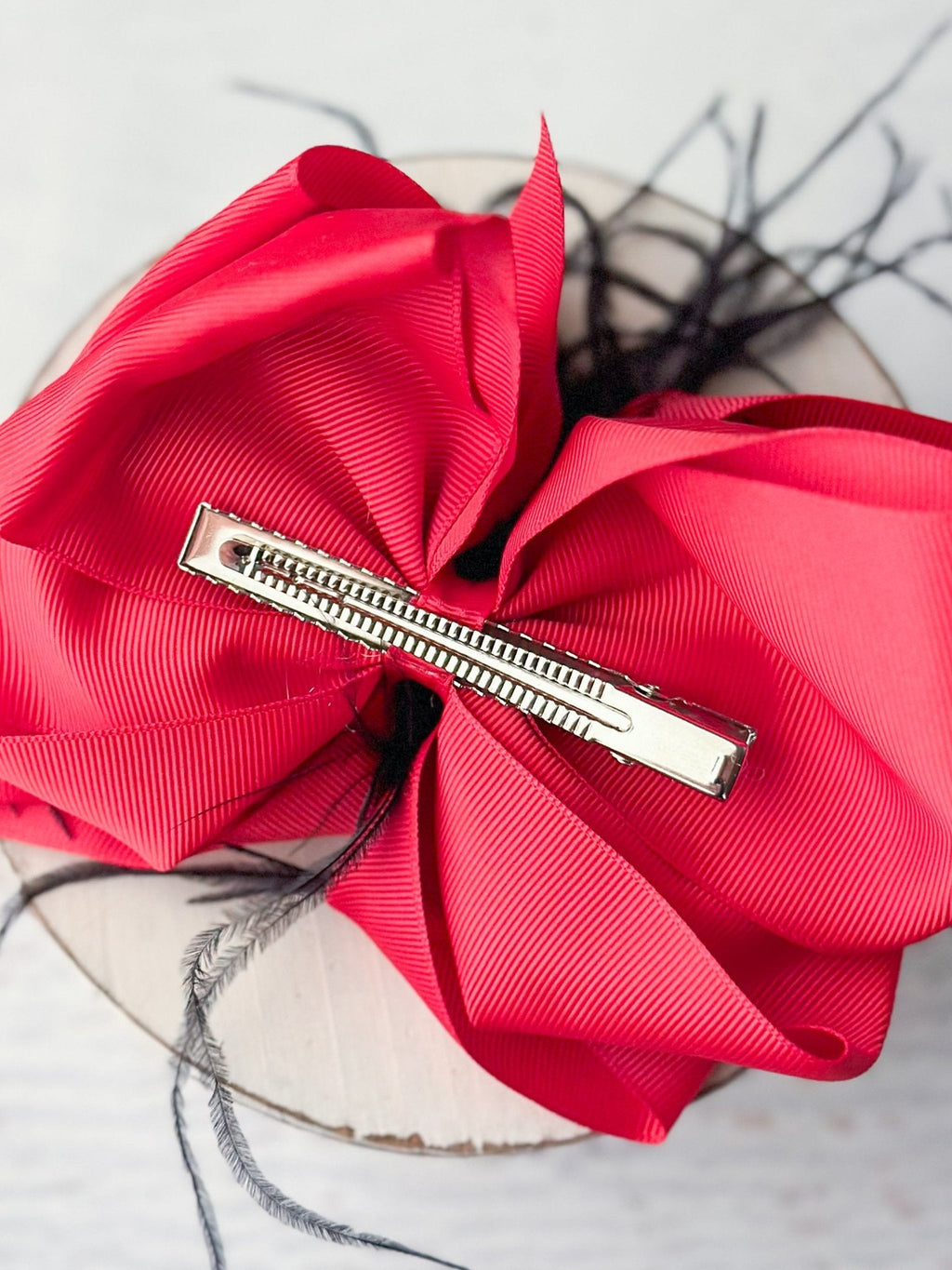 Make a statement with our Texas Size Red & Black Feather Puff Hair Bow. The oversized design and fluffy feather puff create a playful yet elegant look. Perfect for adding some personality to any outfit. Get ready to turn heads with this unique accessory!