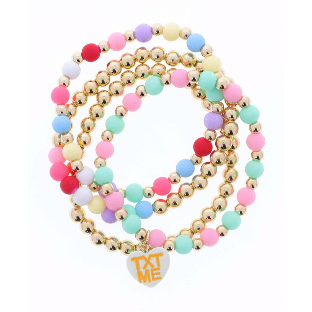 Kids Set of 4, Gold & Ball Beaded, Multi Colored with white "TXT ME" Heart Charm Stretch Bracelet