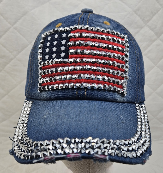 Show off your American pride in style with our Denim Rhinestone American Flag Ball Cap. This trendy women’s baseball hat combines casual denim with dazzling rhinestone embellishments, creating the perfect mix of everyday comfort and standout sparkle.